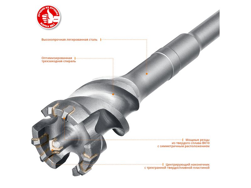 Специальная форма режущей части бура с симметричным расположением твердосплавных резцов обеспечивает эффективное сверление любого высокопрочного бетона.