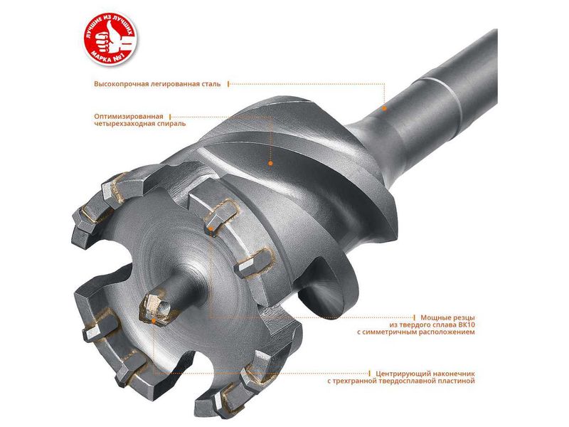 Специальная форма режущей части бура с симметричным расположением твердосплавных резцов обеспечивает эффективное сверление любого высокопрочного бетона.