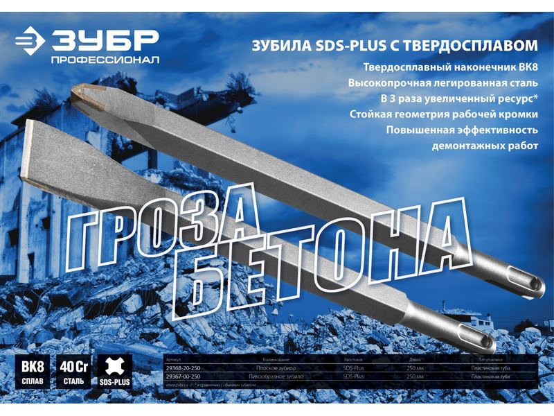 Купить Зубило ЗУБР ПРОФЕССИОНАЛ плоское с твердым сплавом для перфораторов SDS-Plus, 250мм