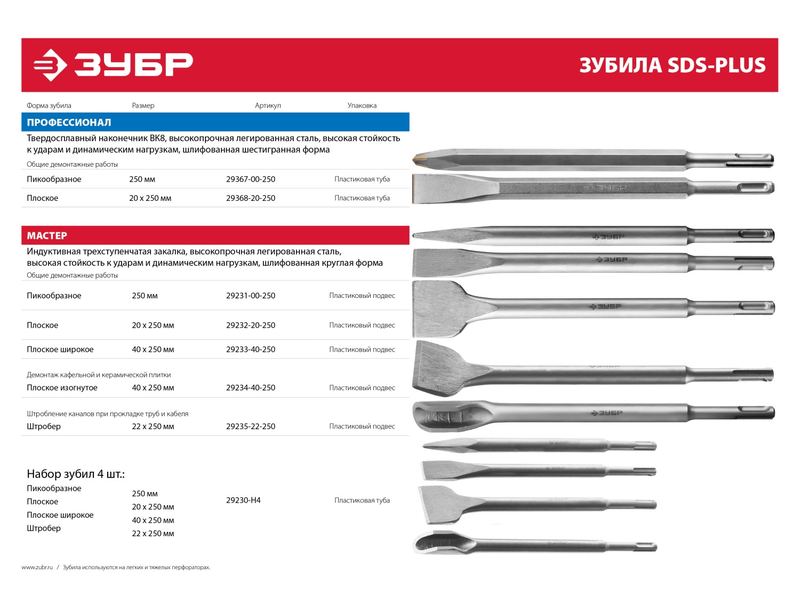 Зубила ЗУБР серии ПРОФЕССИОНАЛ - образец высокого качества и надежности. Предназначено для общих долбежных и демонтажных работ с материалами высокой твердости, такими как кирпичная кладка, бетон или камень.