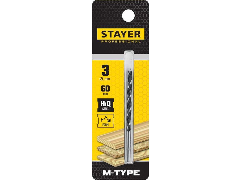 Сверло спиральное по дереву "M-type", М-образная заточка, сталь HCS, STAYER Professional 2942-060-03, d-3мм