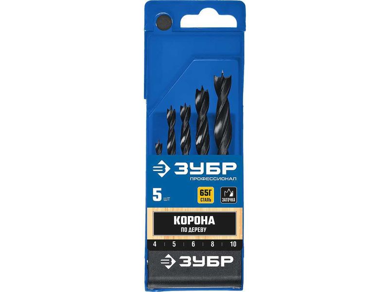 Набор сверл спиральных по дереву, 5шт(d-4-10мм), М-образная заточка, сталь 65Г, ЗУБР Профессионал 29421-H5