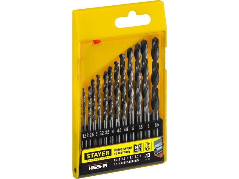 Набор сверл по металлу 13 шт (d-1,5-6,5 мм), HSS-R, сталь М2(S6-5-2), STAYER Professional 29602-H13, DIN 338-424