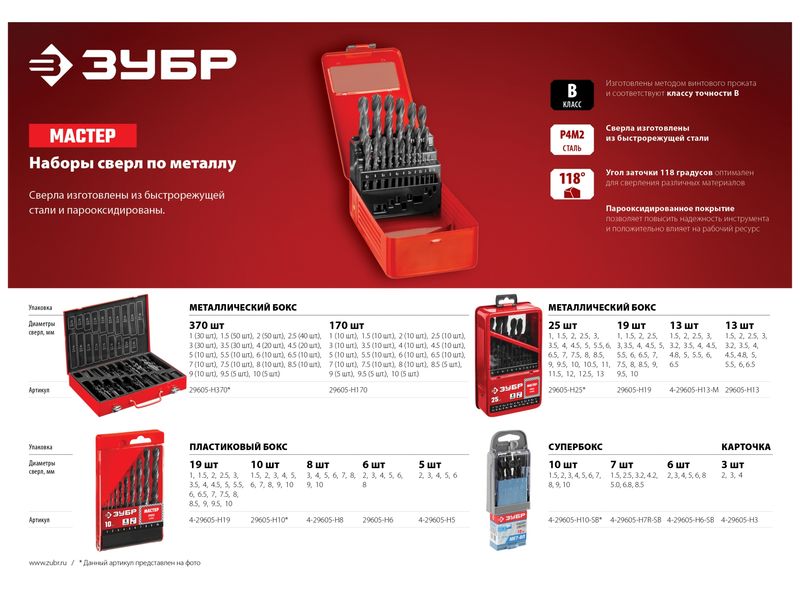 Купить ЗУБР МАСТЕР 370шт(1-10мм), Набор сверл по металлу, сталь Р4М2, класс В, мет.бокс