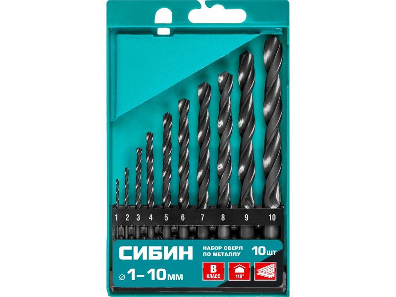 Набор сверл по металлу 10 шт (d-1-10 мм, Класс В, СИБИН 29610-H10-424
