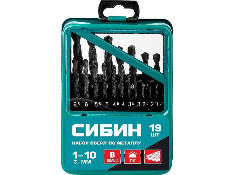 СИБИН 19шт(1-10мм), Набор сверл по металлу, быстрорежущая сталь, класс В, мет.бокс-424