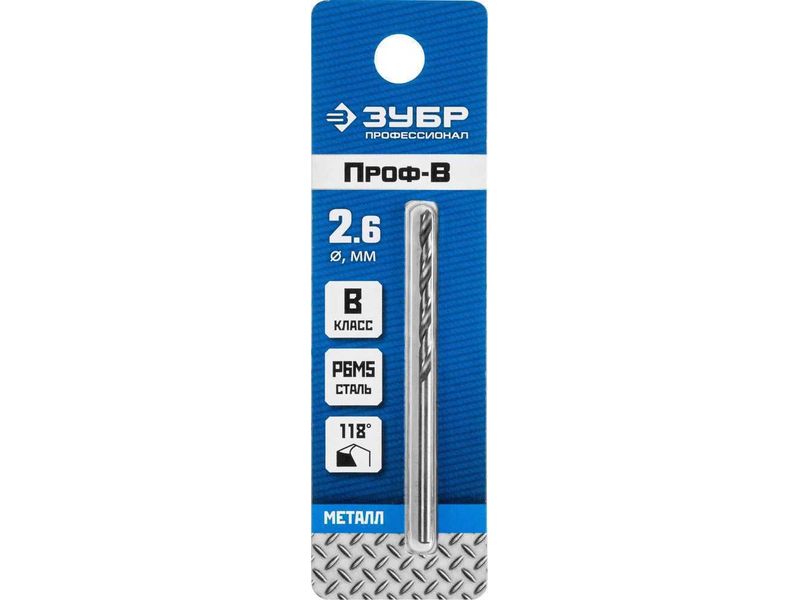 Купить Сверло по металлу Проф-В, класс В, Р6М5, ЗУБР Профессионал 29621-2.6, d-2,6 мм