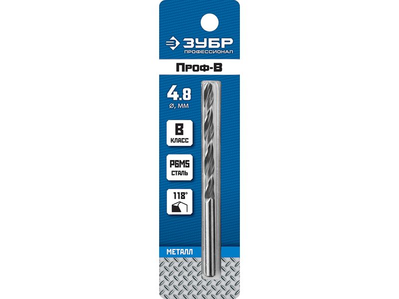 Сверло по металлу Проф-В, класс В, Р6М5, ЗУБР Профессионал 29621-4.8, d-4,8 мм