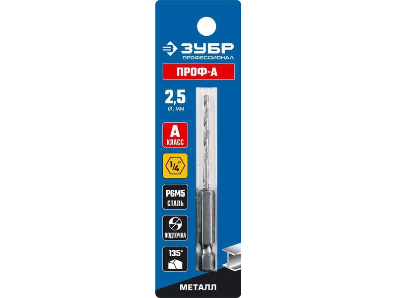 Сверло по металлу НЕХ 1/4", шестигранный хвостовик, класс A, сталь Р6М5, ЗУБР Профессионал 29623-2.5, d-2,5 мм