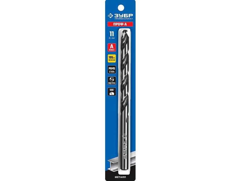 ЗУБР ПРОФ-А 11,0х195мм, Удлиненное сверло по металлу, сталь Р6М5, класс А-568