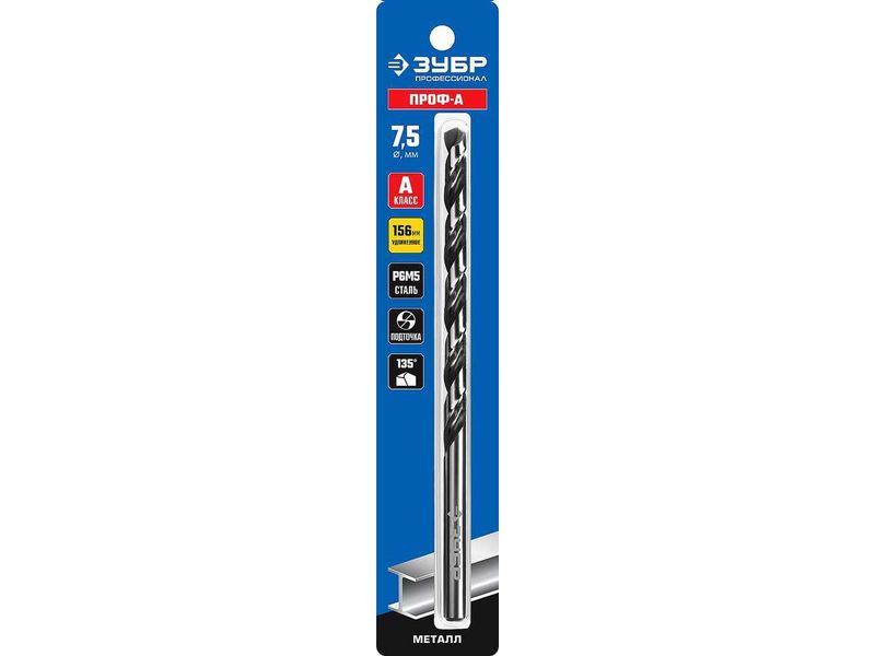 ЗУБР ПРОФ-А 7,5х156мм, Удлиненное сверло по металлу, сталь Р6М5, класс А-568