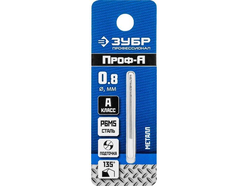 Купить Сверло по металлу Проф-А, класс А, сталь Р6М5, ЗУБР Профессионал 29625-0.8, d-0,8 мм
