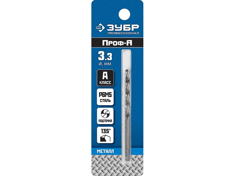 Купить Сверло по металлу Проф-А, класс А, сталь Р6М5, ЗУБР Профессионал 29625-3.3, d-3,3 мм