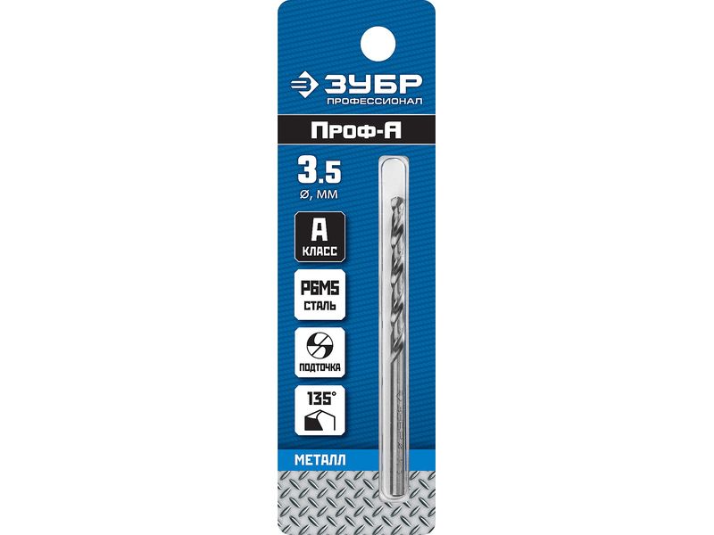 Сверло по металлу Проф-А, класс А, сталь Р6М5, ЗУБР Профессионал 29625-3.5, d-3,5 мм