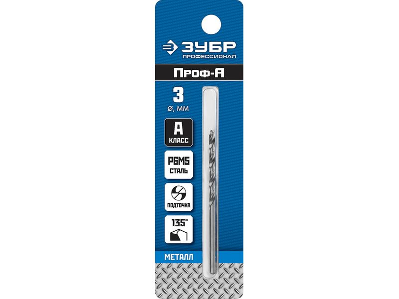 Сверло по металлу Проф-А, класс А, сталь Р6М5, ЗУБР Профессионал 29625-3, d-3,0 мм