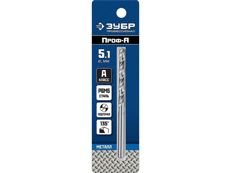 Купить Сверло по металлу Проф-А, класс А, сталь Р6М5, ЗУБР Профессионал 29625-5.1, d-5,1 мм