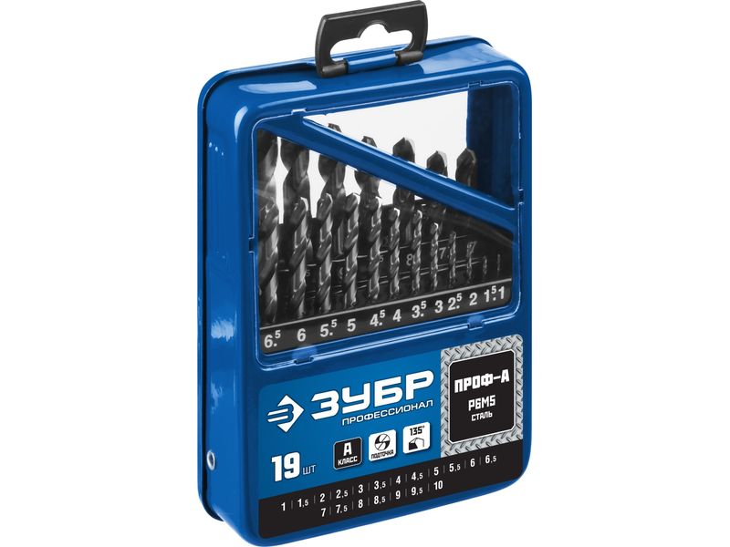 ЗУБР ПРОФ-А 19шт(1-10мм), Набор сверл по металлу, сталь Р6М5, класс А, мет.бокс-424