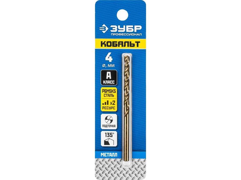 Сверло по металлу КОБАЛЬТ, сталь Р6М5К5, класс А, ЗУБР Профессионал 29626-4, d-4 мм