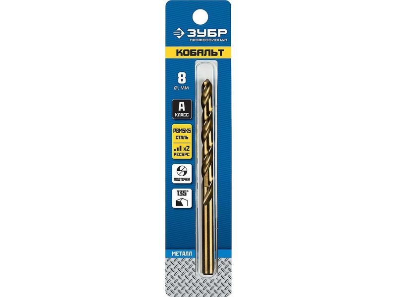 Сверло по металлу КОБАЛЬТ, сталь Р6М5К5, класс А, ЗУБР Профессионал 29626-8, d-8 мм