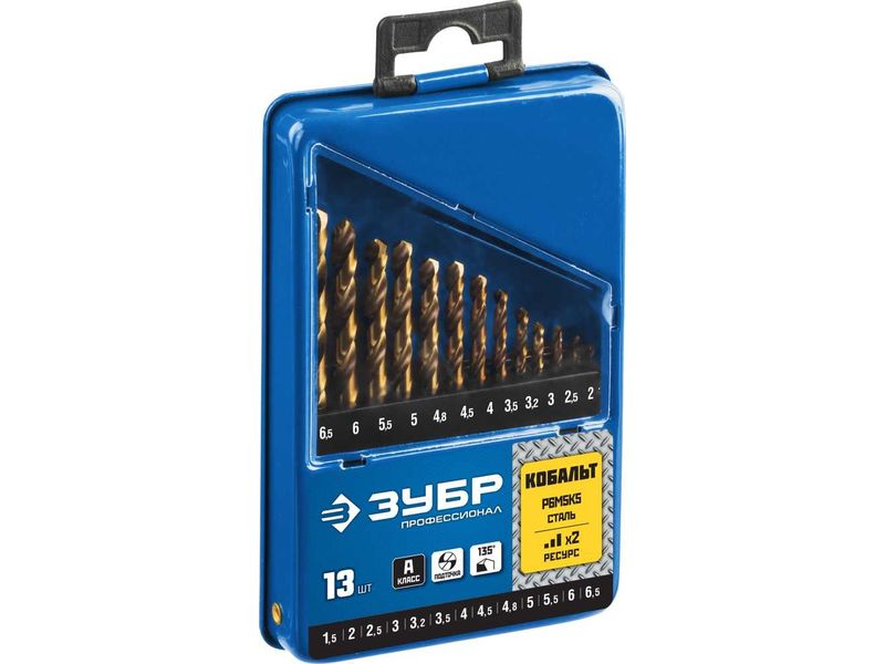 Набор сверл по металлу 13 шт (d-1,5-6,5 мм), КОБАЛЬТ, сталь Р6М5К5, класс А, ЗУБР Профессионал 29626-H13-424