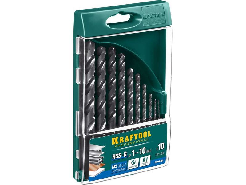 Набор сверл по металлу 10 шт (d-1-10 мм), HSS-G, сталь М2(S6-5-2), класс A, KRAFTOOL 29651-H10, DIN 338 |