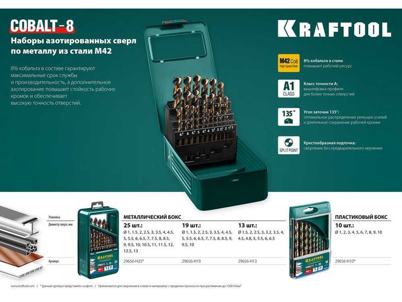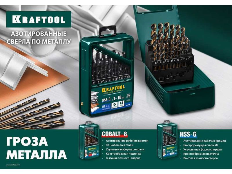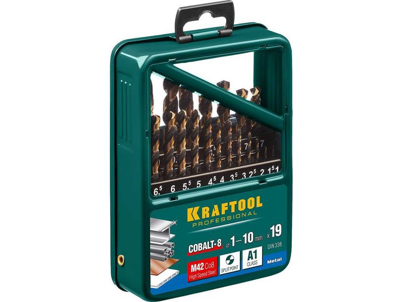 KRAFTOOL COBALT 19шт(1-10мм), Набор сверл по металлу HSS-Co(8%), сталь М42(S2-10-1-8)-569