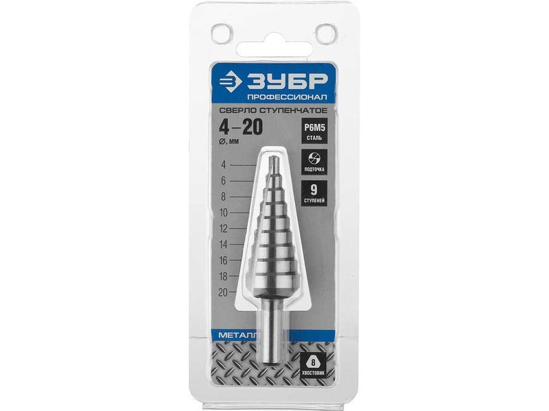 Сверло ЗУБР ступенчатое по сталям и цвет. мет. ст. Р6М5, d 4-20мм, 9ступ. d 4-20, L-75 мм, трехгран. хвост. 8мм
