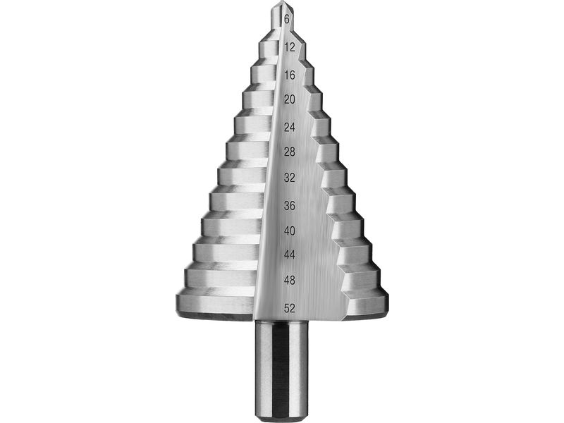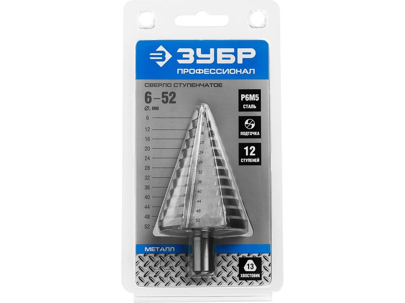 Купить Сверло ЗУБР ПРОФЕССИОНАЛ ступенчатое по сталям и цвет. мет., ст. Р6М5, 6-52, 12 ступ., трехгран. хв., L- 100 мм, 13мм