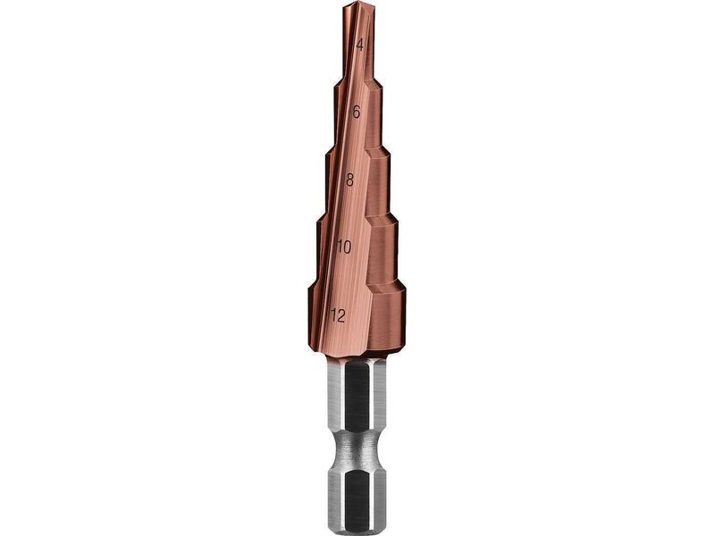 Сверло ЗУБР КОБАЛЬТ ступен. по сталям и цвет. мет. ст. Р6М5 с кобальт. покрыт., d-4-12мм, 5ст. d-4-6-8-10-12, L-65мм, 6-тигр.хв.1/4