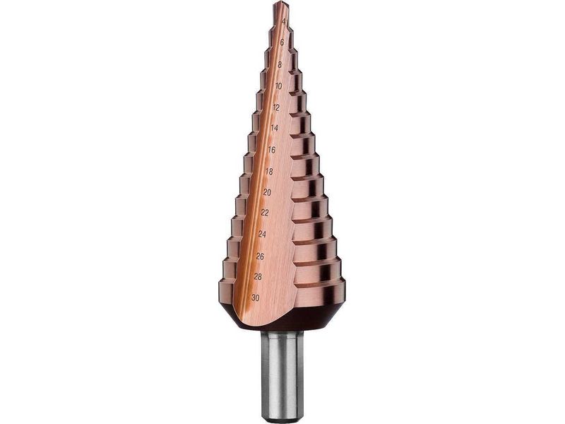 Сверло ЗУБР КОБАЛЬТ ступен. по сталям и цвет. мет. ст. Р6М5 с кобальт. покрыт., d 4-30мм,14ст. d 4-30, L-100мм, трехгр.хв.10мм