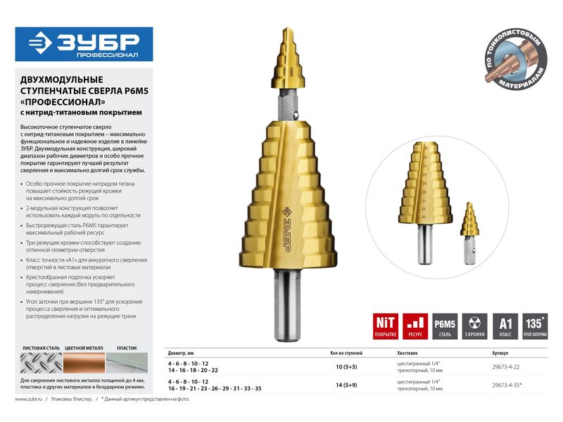 Купить Сверло ЗУБР ПРОФЕССИОНАЛ ступенчатое 2-х модульное по сталям и цвет. мет., ст. Р6М5 с покрытием NIT, 4-35(4-12, 16-35), 14 ступ., трехгран. хв.