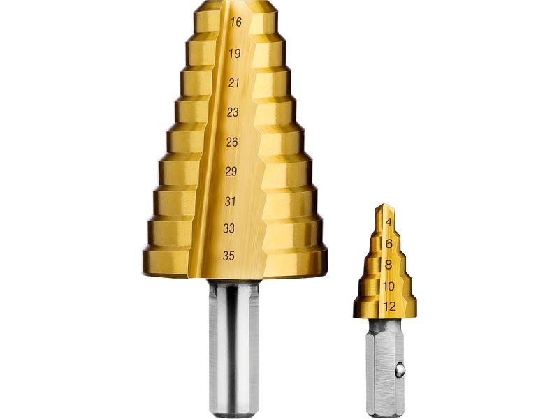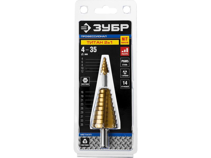 Сверло ЗУБР ПРОФЕССИОНАЛ ступенчатое 2-х модульное по сталям и цвет. мет., ст. Р6М5 с покрытием NIT, 4-35(4-12, 16-35), 14 ступ., трехгран. хв.