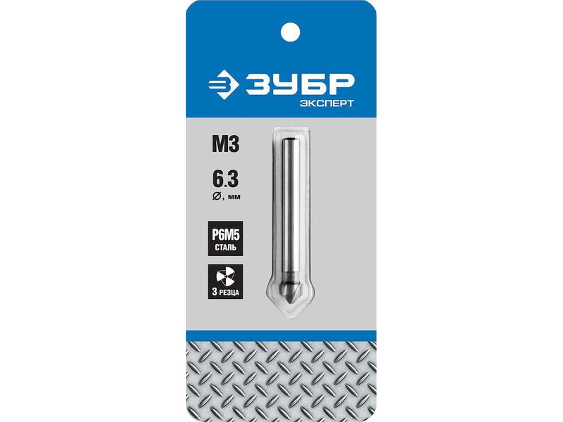 Купить Зенкер ЗУБР "ЭКСПЕРТ" конусный с 3-я реж. кромками, сталь P6M5, d 6,3х45мм, цилиндрич.хв. d 5мм, для раззенковки М3