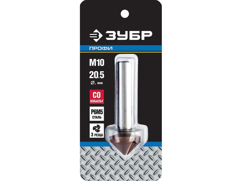 Зенкер ЗУБР "ЭКСПЕРТ" конусный с 3-я реж.кром.ст.P6M5 с Co покрыт.d 20,5х63 мм,цилиндр хвост.d 10мм, для раззенков.М10