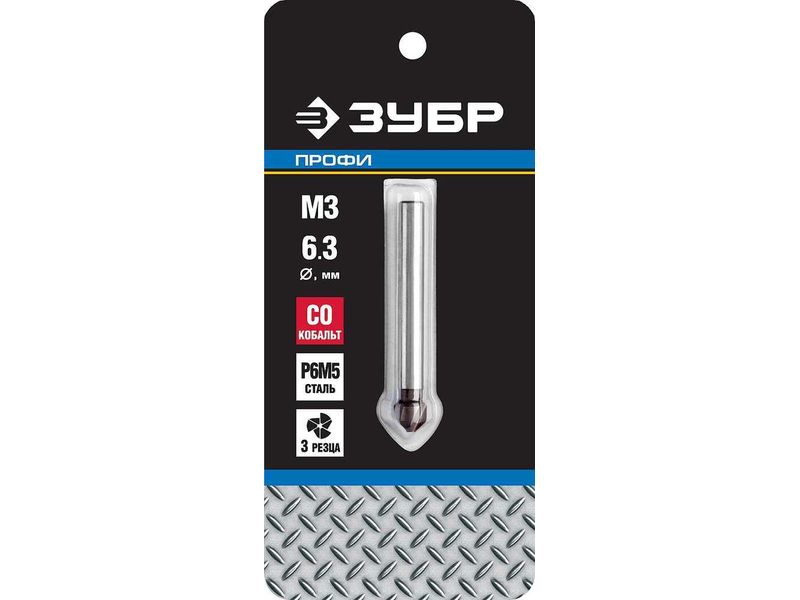 Зенкер ЗУБР "ЭКСПЕРТ" конусный с 3-я реж. кром.ст.P6M5 с Co покрыт.d 6,3х45 мм, цилиндр хвост.d 5мм, для раззенков. М3