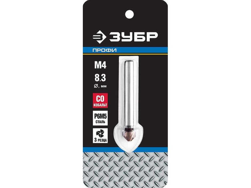 Зенкер ЗУБР "ЭКСПЕРТ" конусный с 3-я реж. кром.ст.P6M5 с Co покрыт.d 8,3х50 мм, цилиндр хвост.d 6мм, для раззенков. М4