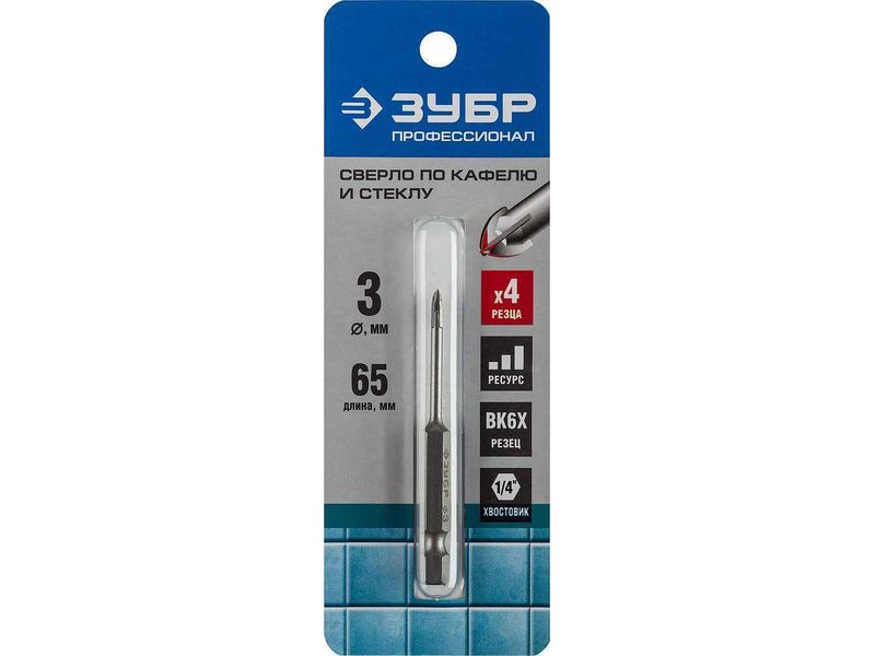 Купить Сверло по кафелю, керамике, стеклу, с четырьмя режущими лезвиями, шестигранный хвостовик, 3 мм, ЗУБР "Профессионал" 29845-03
