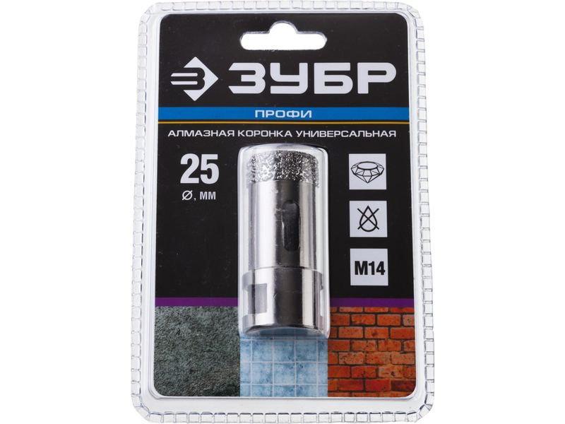 Алмазная коронка ЗУБР "ПРОФЕССИОНАЛ" универсальная для УШМ, сухое сверление, алмазы на вакуумной пайке, посадка М14, d 25мм |