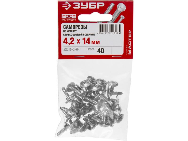 Саморезы ЗУБР с прессшайбой и сверлом по листовому металлу до 2 мм, PH2, 4,2х14 мм, 40шт