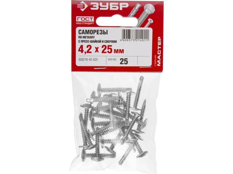 Саморезы ЗУБР с прессшайбой и сверлом по листовому металлу до 2 мм, PH2, 4,2х25 мм, 25шт