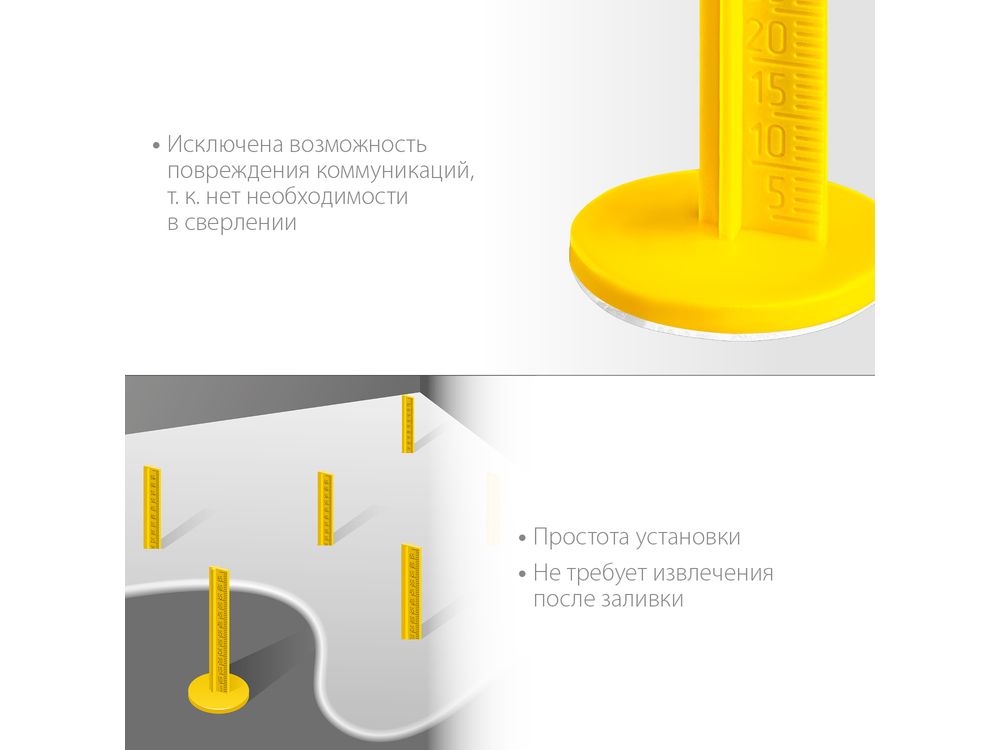 Контроль уровня при помощи маяков значительно упрощает работу, позволяя залить идеально ровный наливной пол. Простая установка не требут специальных навыков.