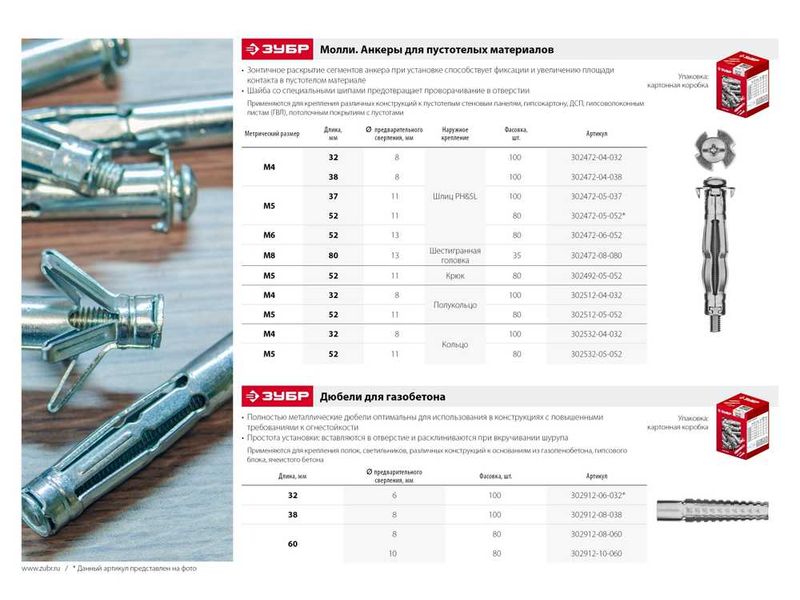 Купить Анкер МОЛЛИ для пустотелых материалов, 11 мм x M5 x 37 мм, 100 шт, оцинкованный, ЗУБР