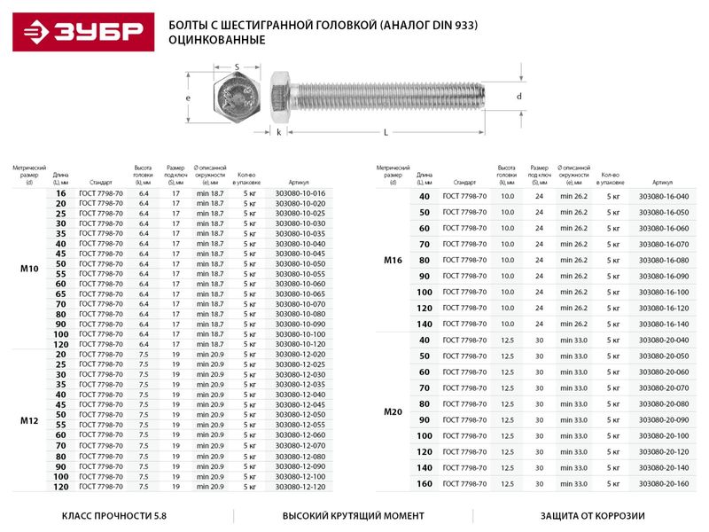 Купить Болт ЗУБР "МАСТЕР" с шестигранной головкой, ГОСТ 7798-70, класс прочности 5.8, оцинкованный, M10x25мм, 5кг Цена: 1 298,00 |