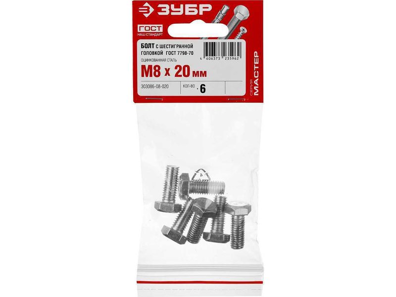 Болт ГОСТ 7798-70, M8 x 20 мм, 6 шт, кл. пр. 5.8, оцинкованный, ЗУБР