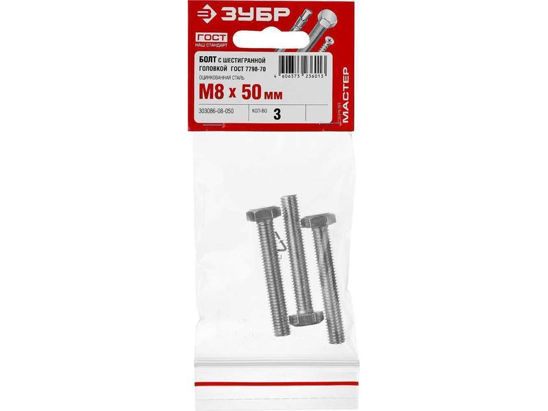 Болт ГОСТ 7798-70, M8 x 50 мм, 3 шт, кл. пр. 5.8, оцинкованный, ЗУБР