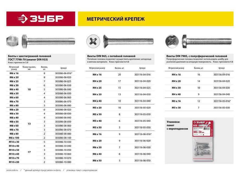 Болт ГОСТ 7798-70, M10 x 50 мм, 3 шт, кл. пр. 5.8, оцинкованный, ЗУБР-650