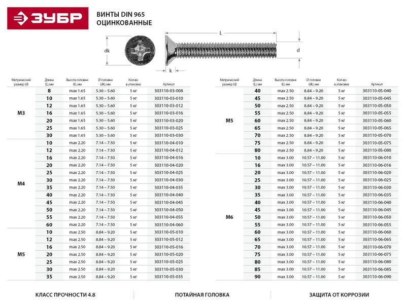 Купить Винт ЗУБР "МАСТЕР" DIN 965, класс прочности 4.8, оцинкованный, M4x25мм, 5кг