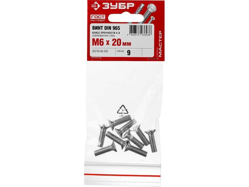 Винт DIN 965, M6 x 20 мм, 9 шт, кл. пр. 4.8, оцинкованный, ЗУБР-652