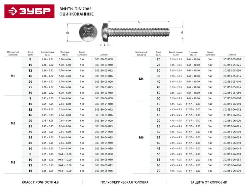 Купить Винт ЗУБР "МАСТЕР" DIN 7985, класс прочности 4.8, оцинкованный, M4x16мм, 5кг