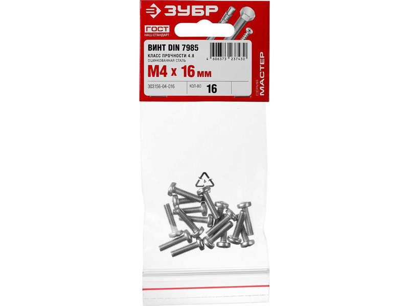 Винт DIN 7985 M4x16мм, 16шт, кл. пр. 4.8, оцинкованный, ЗУБР